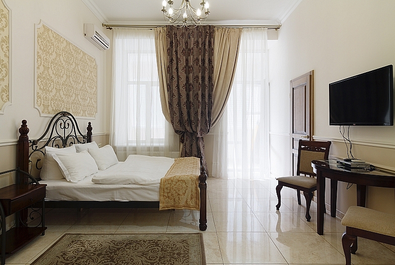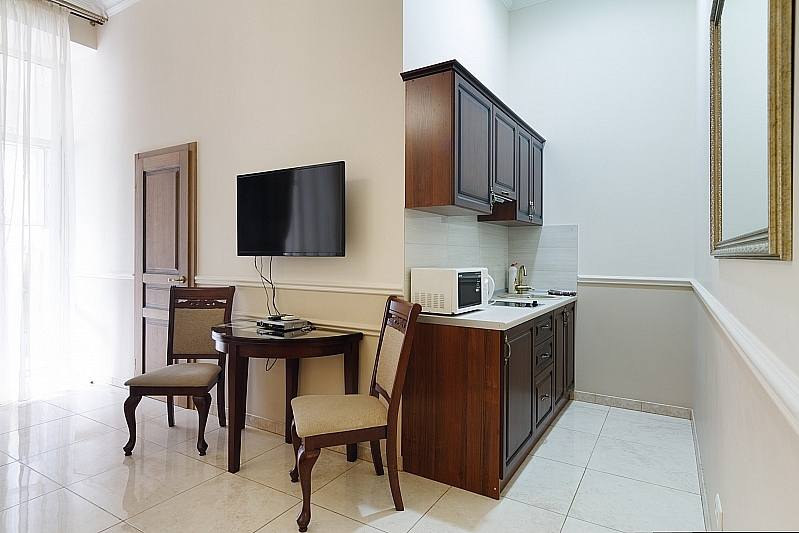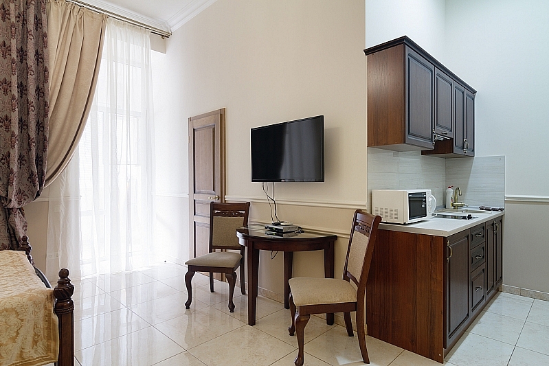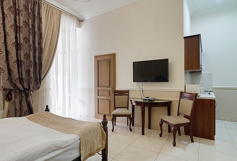 King This luxury studio suite at Theatre Boutique Apart Hotel has been created for those who prefer privacy, want to relax from the busy city hustle and bustle and enjoy highest quality of comfort – all in the most central location of Kyiv.