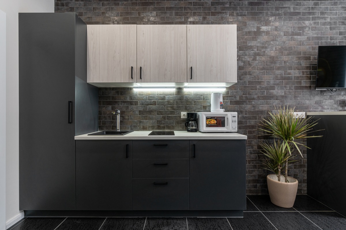 It features a true king sized bed with mood lighting system all around the room along with the bed, 32 Inch Smart LCD TV unit with Youtube, Netflix, etc, wardrobe area (including closet), fully equipped kitchenette (including microwave), dining room table for up to two people, bathroom with shower cabin and an air conditioner. The unit also features a large couch that converts into a full sized bed – providing sleeping places for additional two guests (perfect if traveling with children).