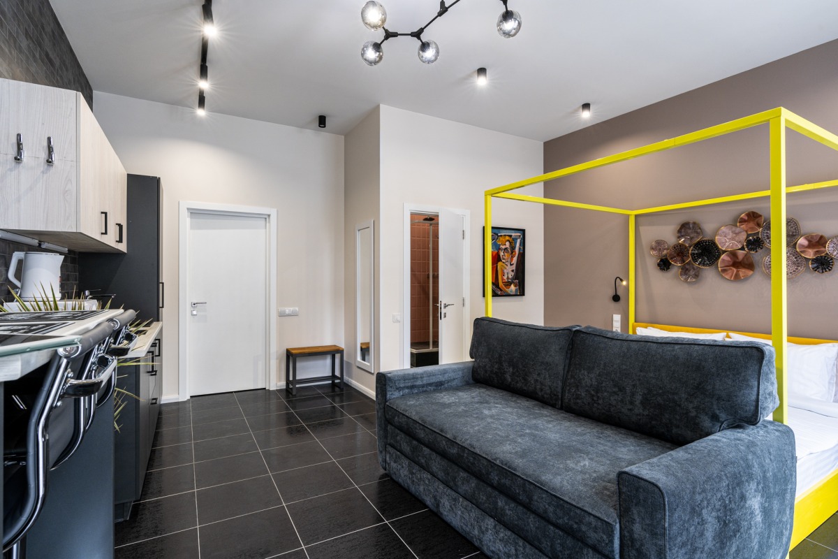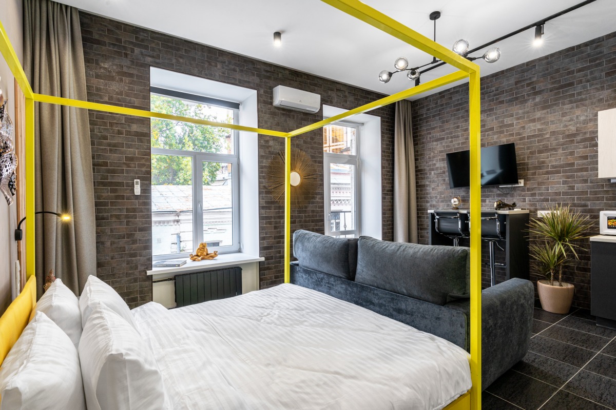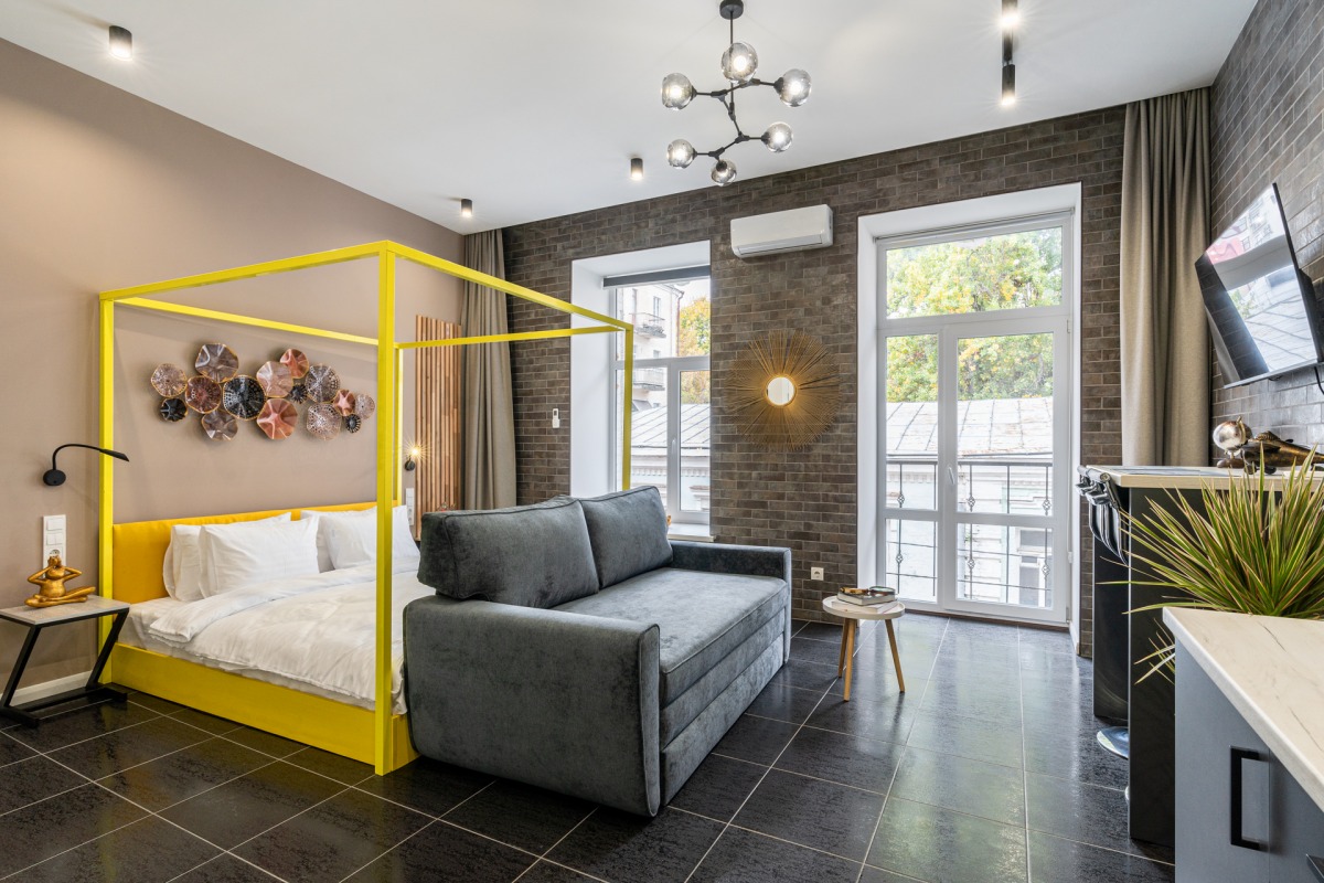 King This extra large loft style studio suite has been created for those who prefer total luxury with every single detail thought out for your convenience. It is also ideal for those that prefer privacy, want to relax from the busy city hustle and bustle and enjoy highest quality of comfort – all in the most central location of Kyiv.
