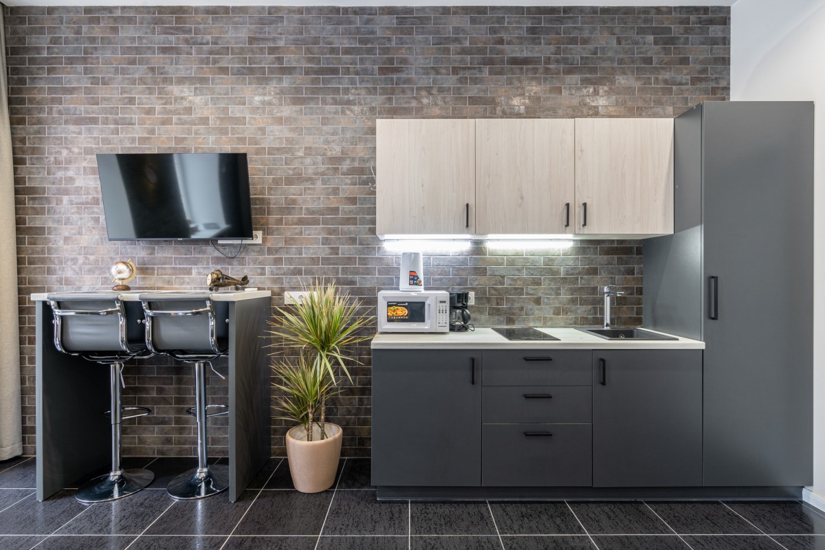 It features a true king sized bed with mood lighting system all around the room along with the bed, 32 Inch Smart LCD TV unit with Youtube, Netflix, etc, wardrobe area (including closet), fully equipped kitchenette (including microwave), dining room table for up to two people, bathroom with shower cabin and an air conditioner. The unit also features a large couch that converts into a full sized bed – providing sleeping places for additional two guests (perfect if traveling with children).