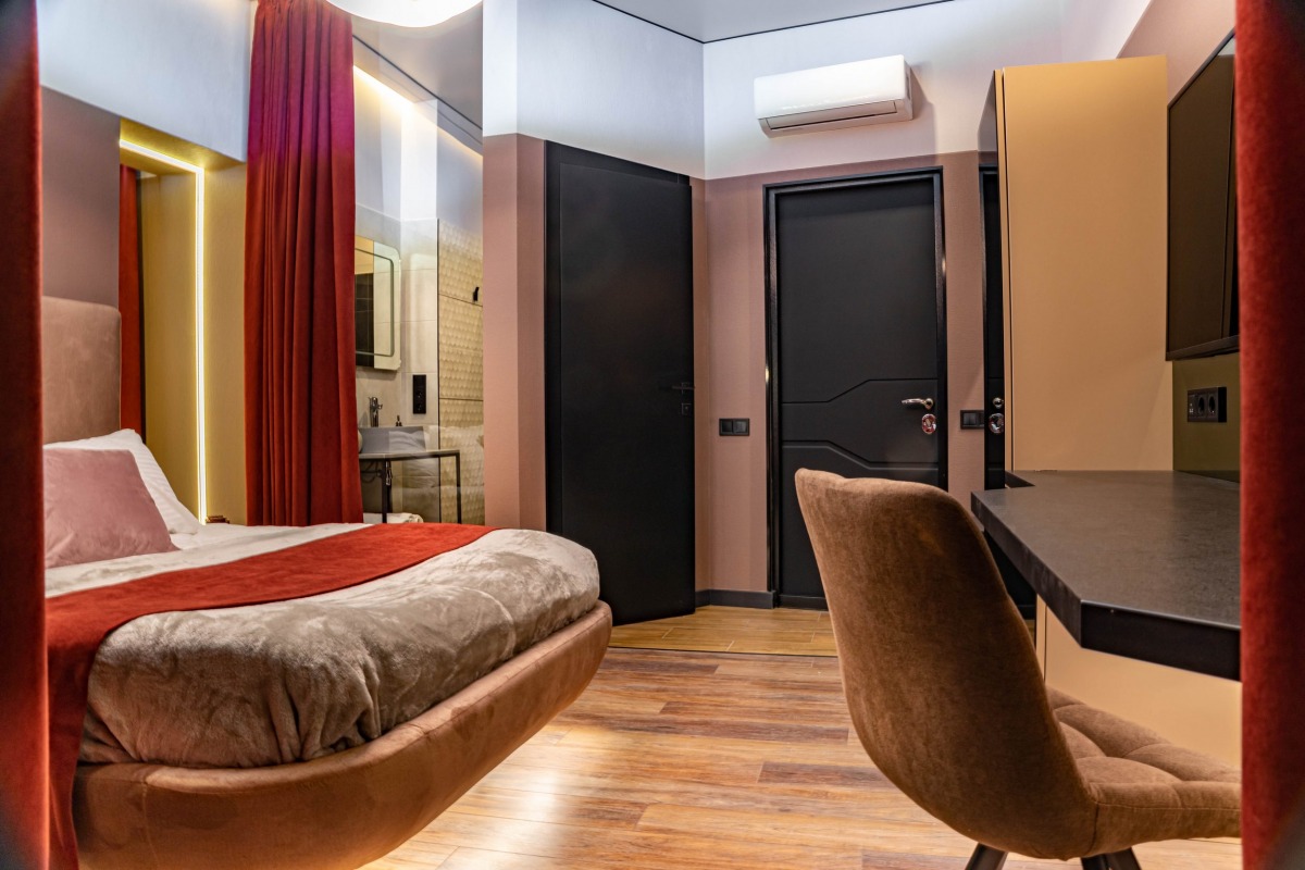 Queen This brand new and luxurious studio has been created for those who prefer total luxury with every single detail thought out for your convenience. It is also ideal for those who prefer privacy, want to relax from the busy city hustle and bustle and enjoy highest quality of comfort – all in the most central location of Kyiv. Interior design was created by a renowned local architect, catering attention to everything demanding travelers could want. Renovation was completed in late 2020.