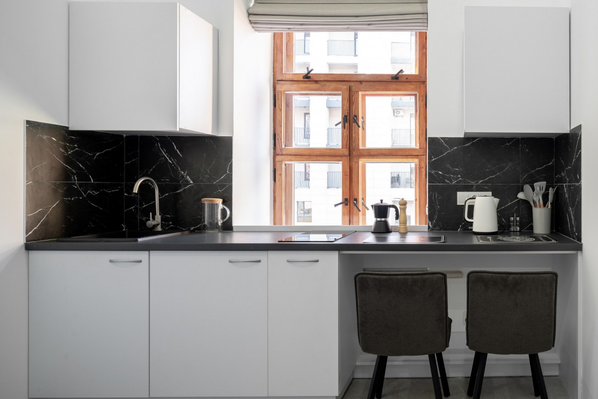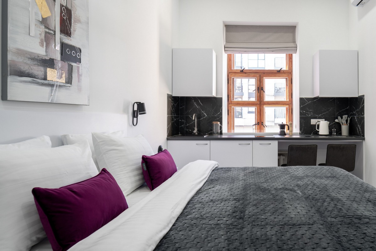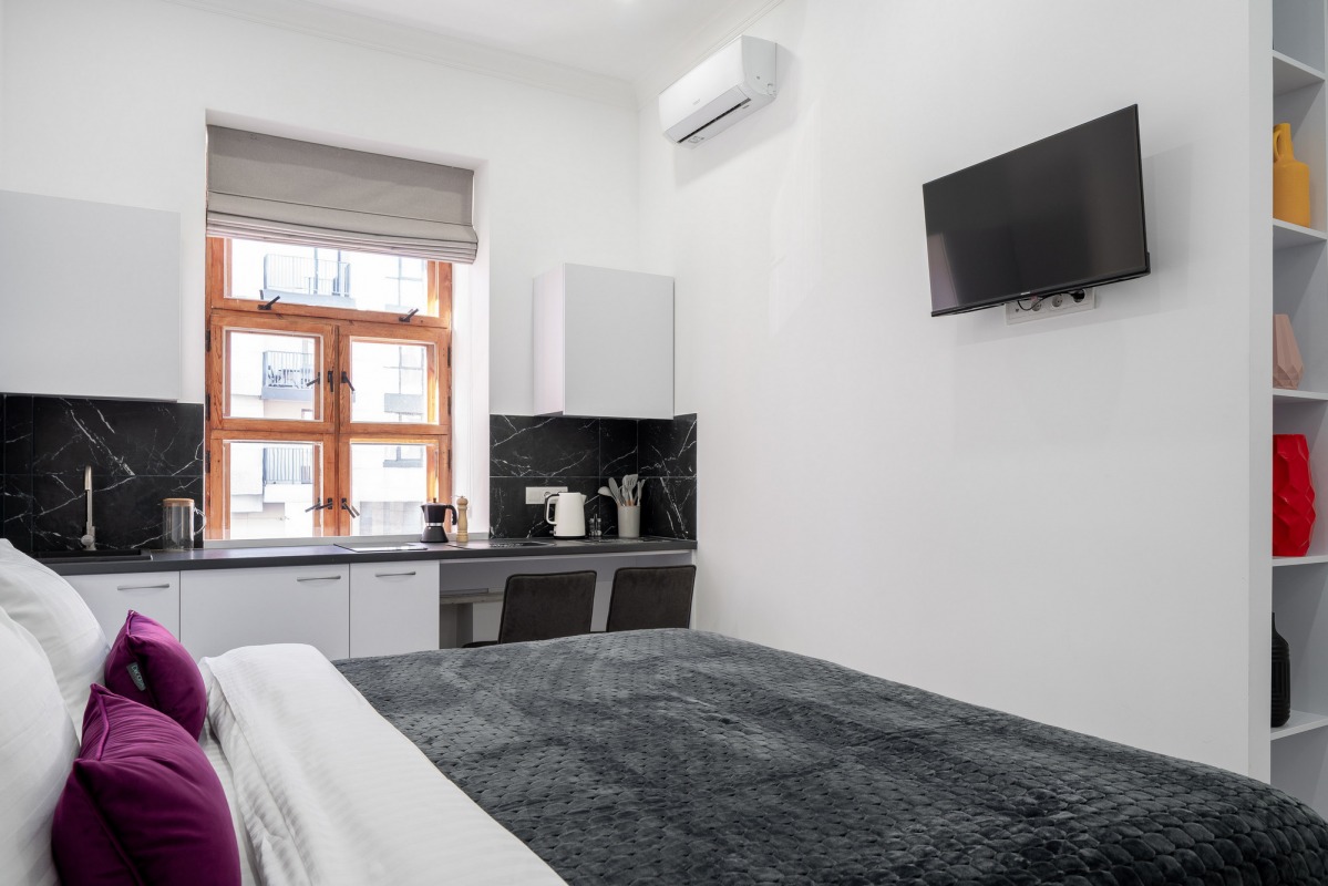 King This brand new studio apartment (renovation completed in late 2024) has been created for those who prefer total luxury with every single detail thought out for your convenience. It is also ideal for those that prefer privacy, want to relax from the busy city hustle and bustle and enjoy highest quality of comfort – all in the most central, yet quiet location of Kyiv.