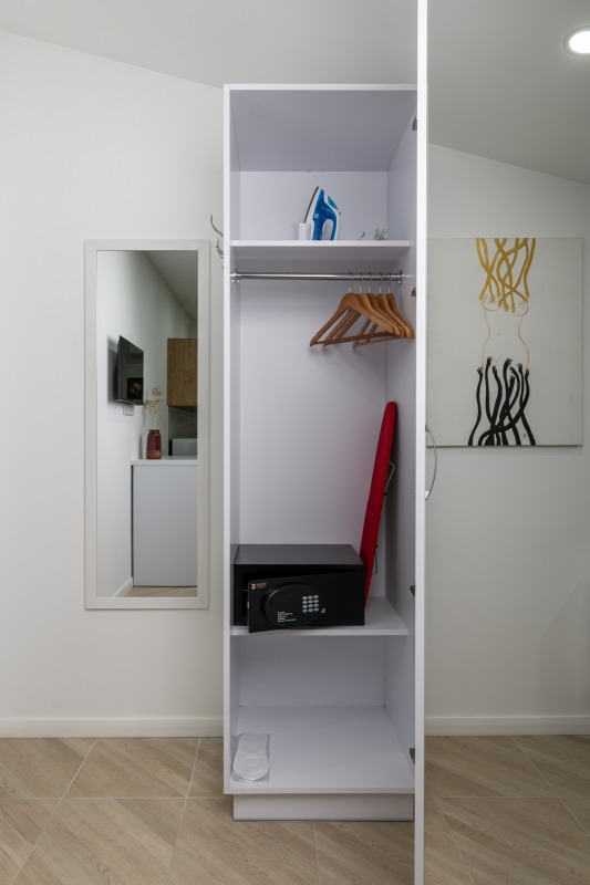 It features a queen sized bed with mood lighting system all around the roo, 32 Inch Smart LCD TV unit with Youtube, Netflix, etc, wardrobe area (including closet), fully equipped kitchenette (including microwave), dining room table for up to two people, bathroom shower cabin and a washing machine.