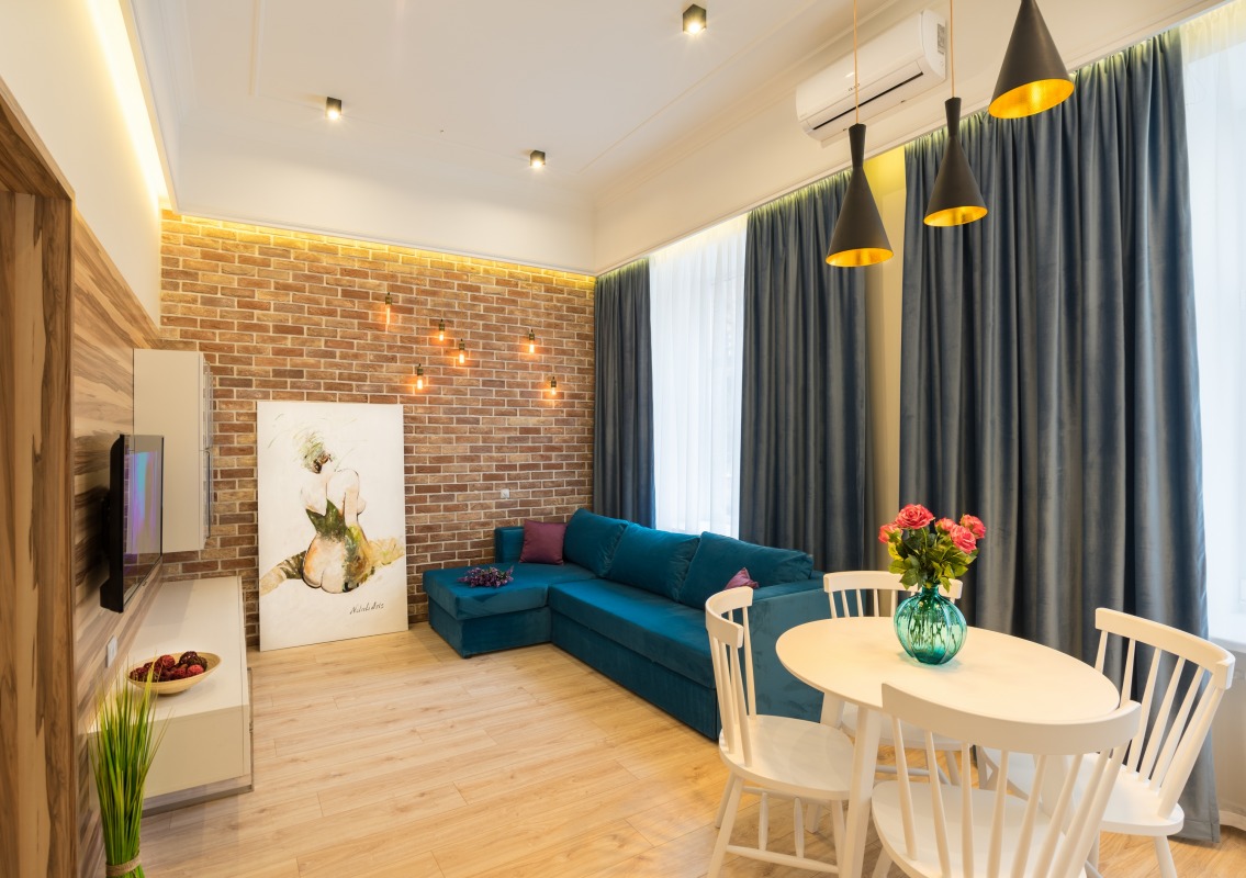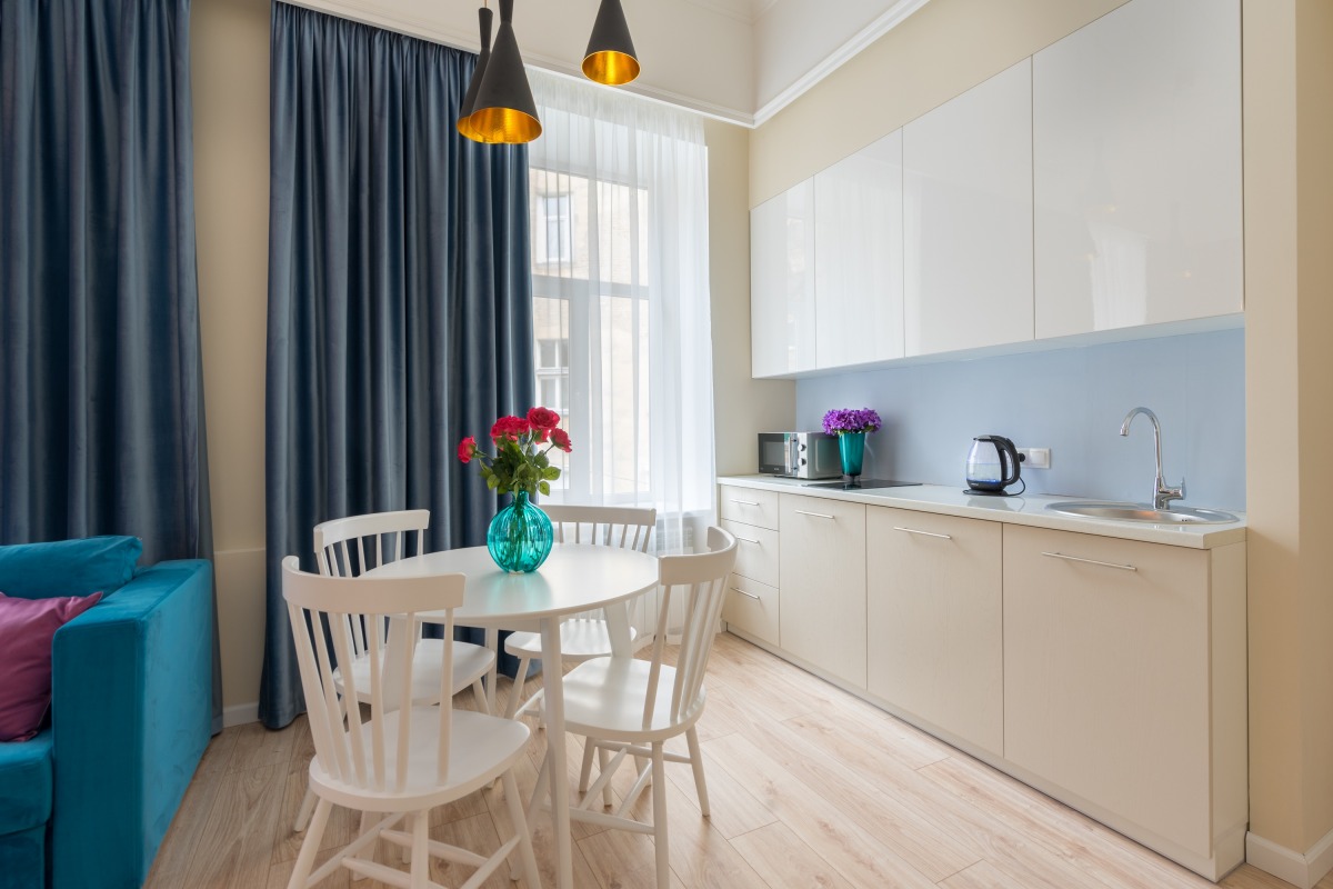 The apartment features a total of three rooms including spacious living room fully equipped with large sectional couch (convertible to queen sized bed), master bedroom with queen sized bed and additional LCD TV and smaller bedroom with another queen sized bed. The apartment includes LCD Smart TV Units (assuring dozens of English channels, including Netflix, etc), fully equipped kitchen with dining room area along with two Air Conditioners. It also features a bathroom with open shower panel, washing machine and much more. The apartment features super high speed Wi Fi Internet, assuring perfect connection every time. The apartment offers lovely view at charming Sofievskaya street through its oversized windows.
