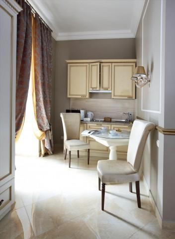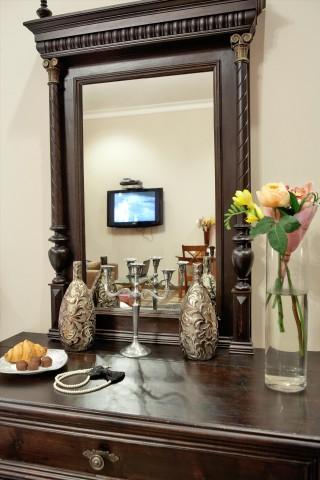 The Theatre Apart-Hotel offers air conditioned apartments with 4 meter height ceilings and elegant furnishings. They all feature a bathroom with private jacuzzi and bathtub or shower. Shown in the current listing is a studio luxury suite, which features a spacious living room area along with large couch (convertible into full sized bed), 32 Inch LCD TV with over 100 channels including English such as BBC, CNN, Discover, etc, dining room table with seating for up to three people, king sized bed, wardrobe area, large bathroom with Jacuzzi & Shower, Air Conditioners in each room and much more. The fully-equipped kitchen includes a refrigerator and a microwave, as well as a washing machine. The living area has a widescreen satellite TV with DVD player.