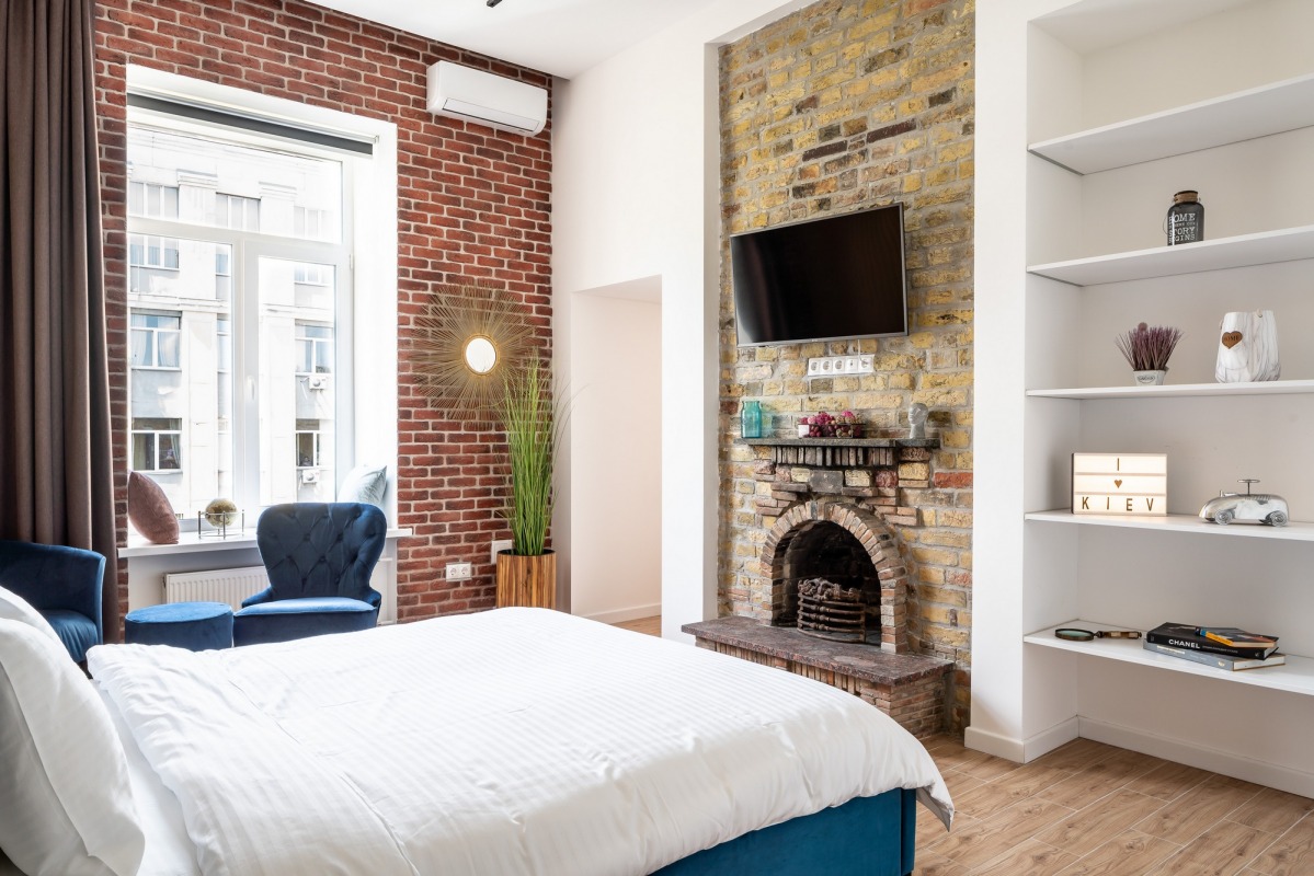 У ньому є ліжко розміру "queen-size" із системою декоративного освітлення, РК-телевізор Smart TV (забезпечує десятки англійських каналів, включаючи Netflix, Youtube тощо), повністю обладнану кухню з обідньою зоною, ванну кімнату з душовою кабіною, пральну машину, кондиціонер і багато іншого. У квартирі є надшвидкісний Wi-Fi Інтернет, що гарантує ідеальне підключення кожного разу.Вікна квартири виходять у тихий київський двір, ідеальний для глибокого сну.