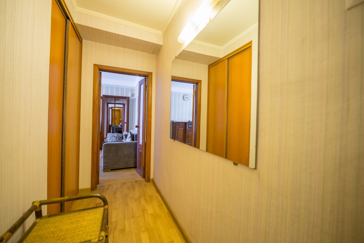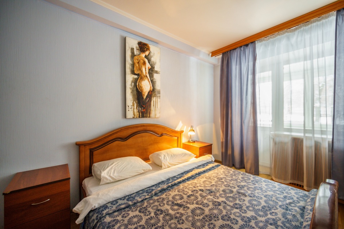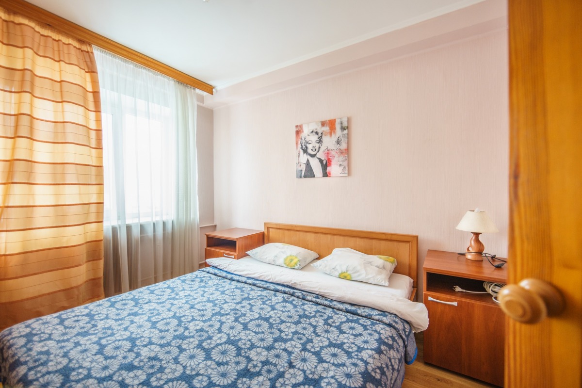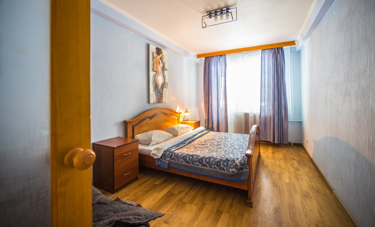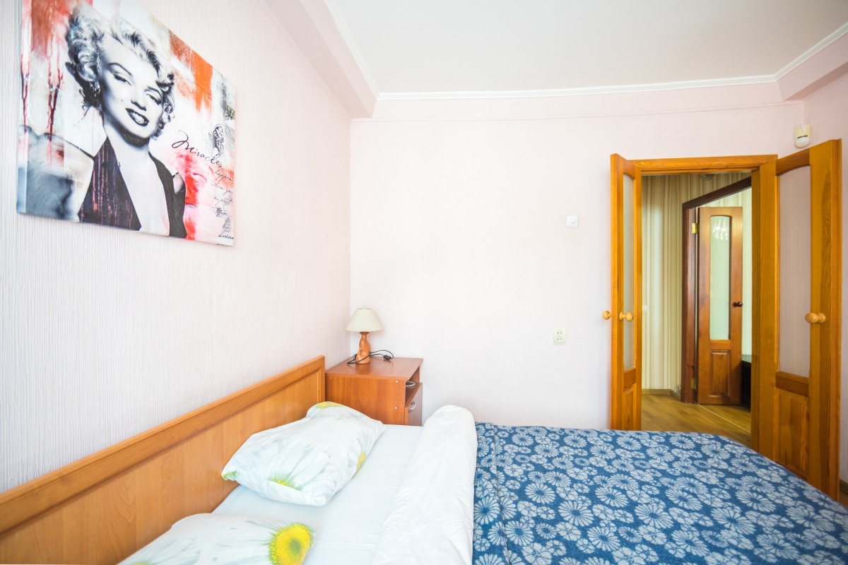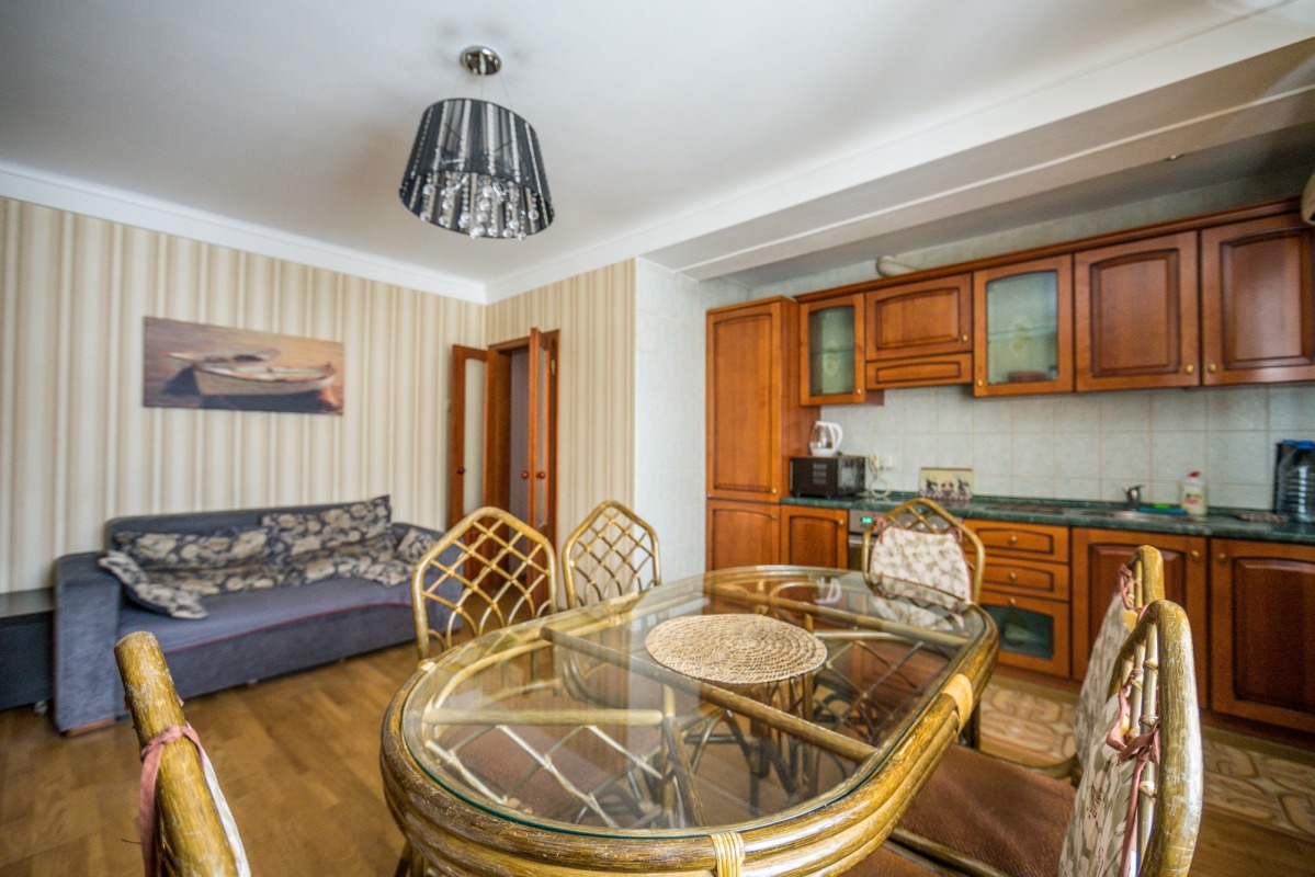 Апартаменти знаходяться на 2-му поверсі 9-поверхового будинку (ліфт є) і у них є все необхідне для комфортного проживання: простора вітальня, вікна якої пропускають багато світла, розкладний диван, містка шафа для одягу, РК-телевізор діагоналлю в 32 дюйми, кабельне телебачення (понад 100 каналів), високошвидкісний інтернет (Wi-Fi), DVD програвач, дві роздільні спальні кімнати з двоспальними ліжками, кондиціонери, закритий балкон з приємним видом на тихий двір. До ваших послуг кухня обладнана всім необхідним для приготування їжі і обідня зона на чотири персони. У квартирі також є велика ванна кімната з джакузі на двох, пральна машина і багато іншого для вашого комфортного проживання в самому центрі столиці.