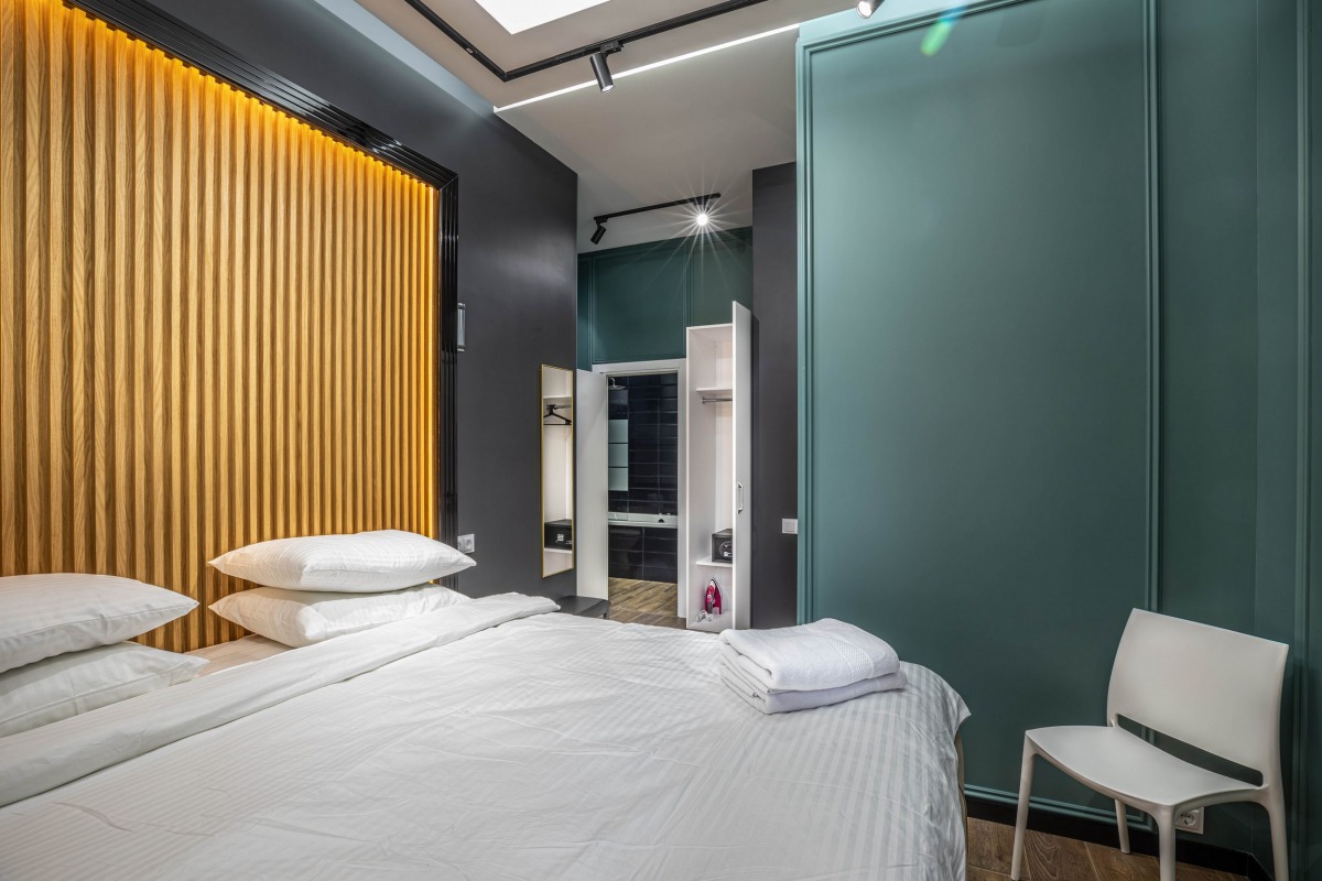 До послуг гостей справжнє двоспальне ліжко розміру "king-size" із системою підсвічування настрою, ЖК-телевізор Smart TV (із десятками англійських каналів,