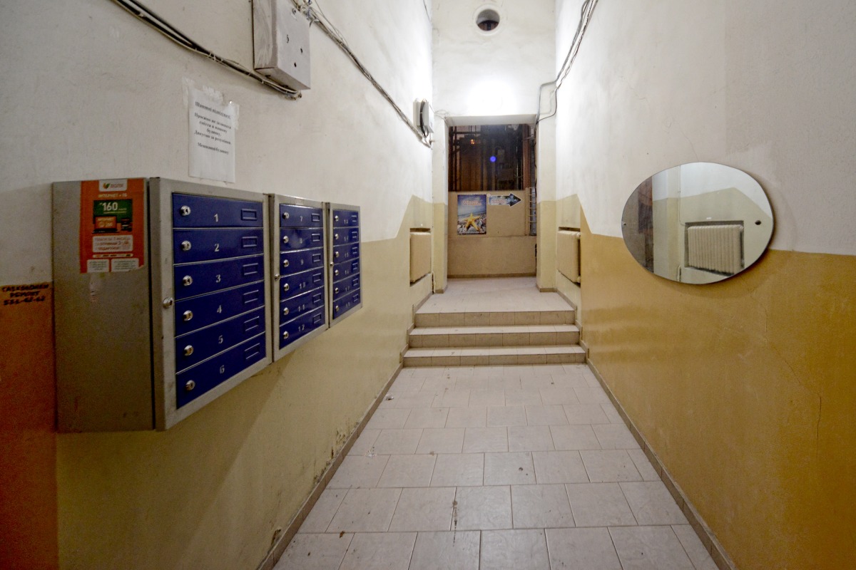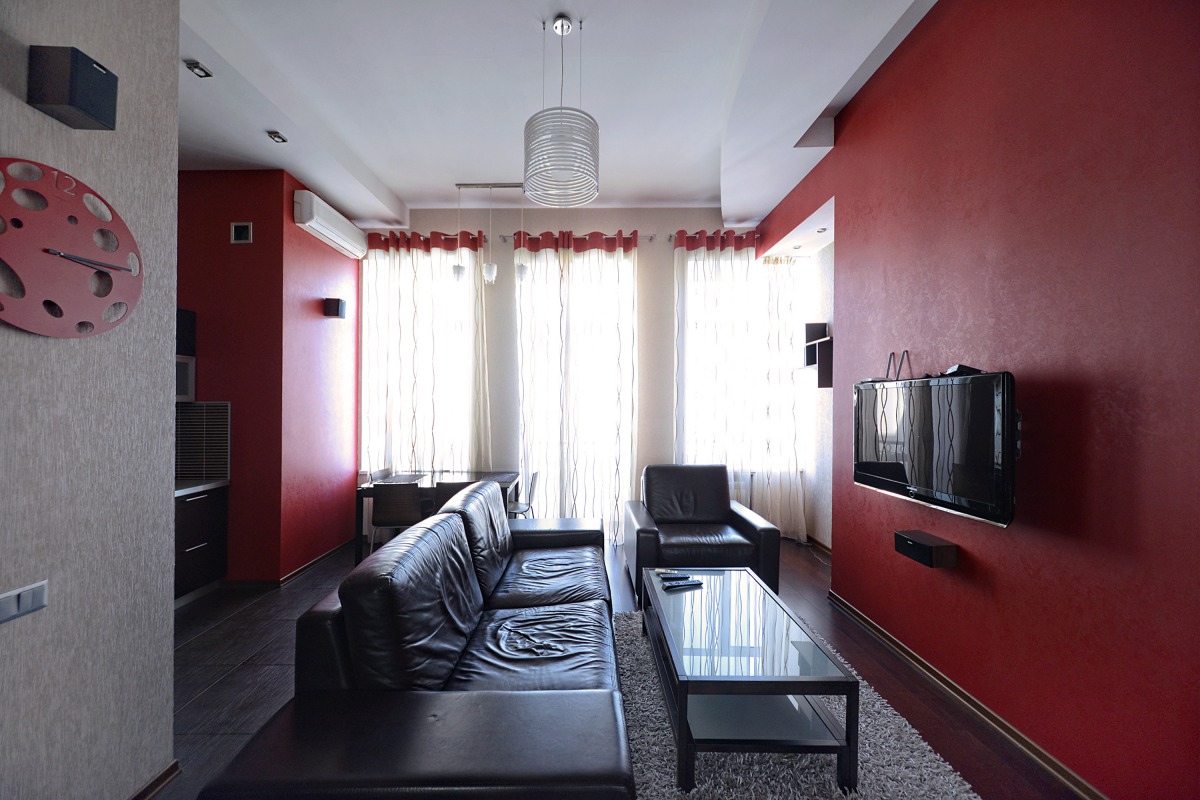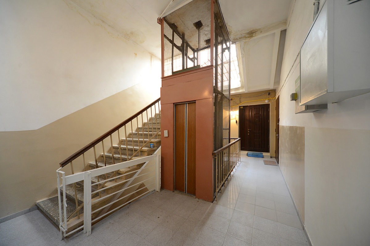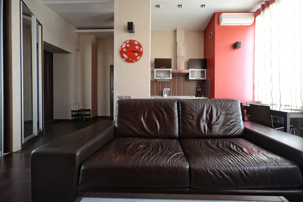 Квартира розташована на 4-му поверсі, з доступом з вулиці та ліфтом. Вона включає в себе простору вітальню з шкіряним диваном
